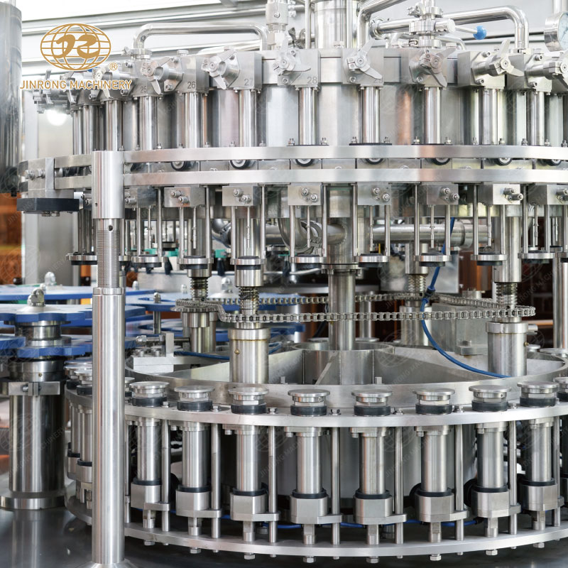 三合一含汽飲料灌裝機集清洗、灌裝、旋蓋于一體的灌裝設備,成套飲料生產(chǎn)線適合汽水、可樂、蘇打水、氣泡水等。玻璃瓶含汽飲料灌裝機組內(nèi)部一次完成洗瓶、灌裝、封蓋三道工序,瓶子磨損小、傳動準確平穩(wěn)、瓶型更換便捷。